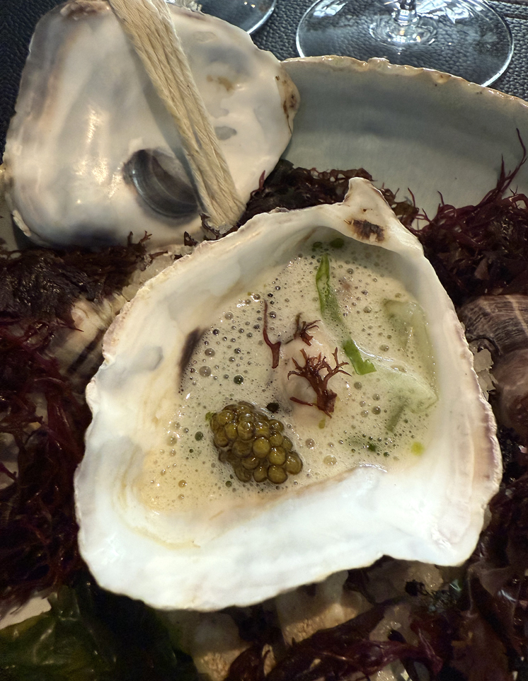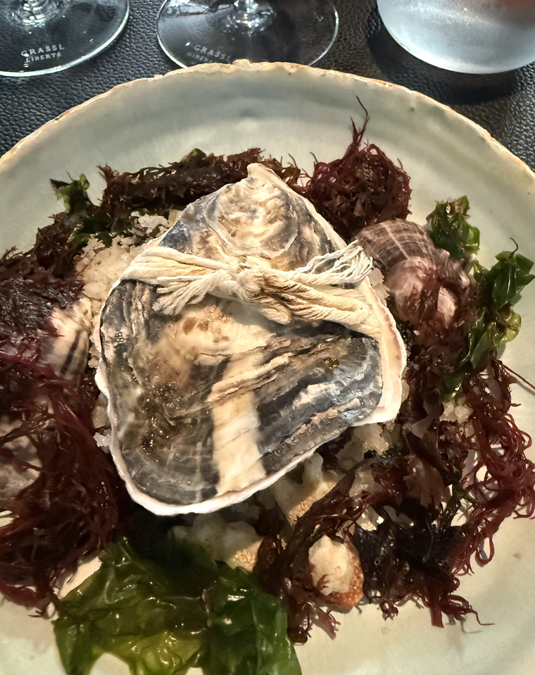 A single Pacific gold oyster from Moro Bay arrives on a bed of kelp, its top shell wrapped in twine. You’re instructed to lift off the shell to reveal the plump oyster that sits on a thin layer of chawanmushi with cucumber. The server spoons over a foamed cucumber sauce to complete the dish. The egg custard is soft and custardy. The cucumber and a bit of rice vinegar together create a dish that has the whoosh of a sea breeze.