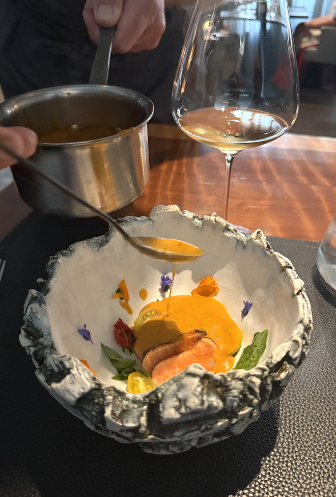 A scallop that’s been smoked gets presented at the table in a donabe before being whisked away to finish plating. Since I’m allergic, I get buttery tasting salmon slices instead. Both get finished with a creamy, slightly sweet Sun Gold tomato sauce. Good thing this course is served with crispy, buttery brioche because you’ll want to use it to mop up every bit of this lusty sauce.