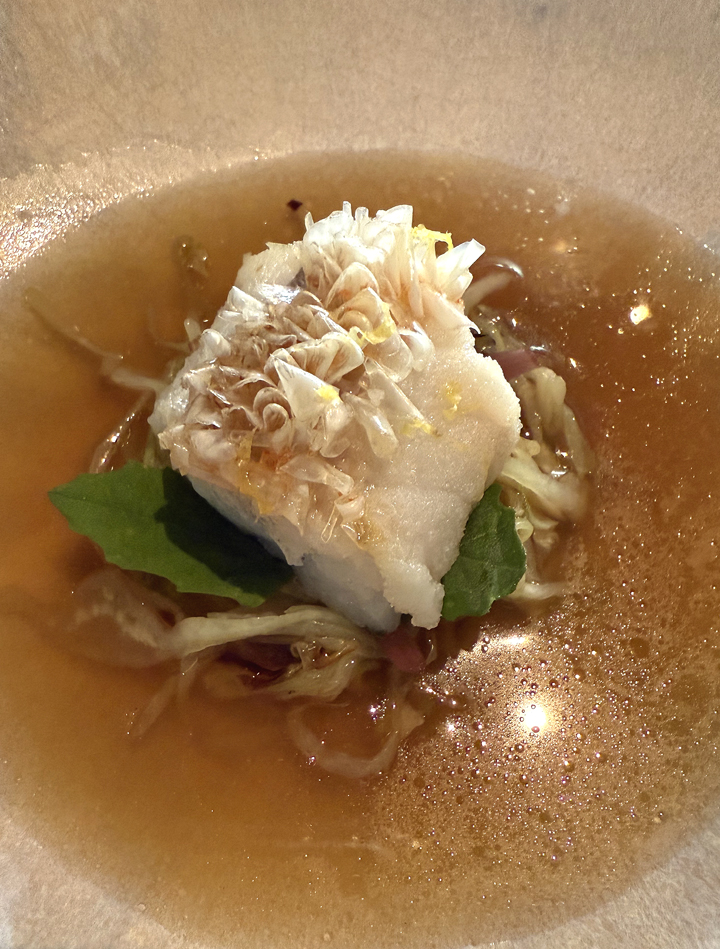 Next, a dish that’s been a staple at Aubergine, though, gets changed up regularly. Amadai or tilefish sports scales that are edible. Cogley makes them especially irresistible by pouring hot oil over them so they get as crisp and easy to eat as potato chips. A fish bone broth gets poured over it like a delicate dashi.
