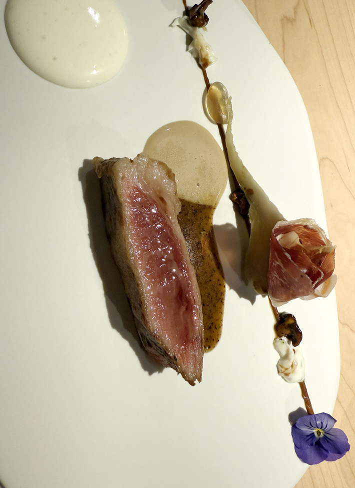 A tender toasted corn ravioli in the shape of a sunflower floats in a pool of creamy corn sabayon with spot prawn and trout roe hiding underneath. The sweetness of the corn accentuates that of the spot prawn. Alongside is blue-corn bread that’s ever so buttery with the pinpoint taste of roasty-toasty corn.