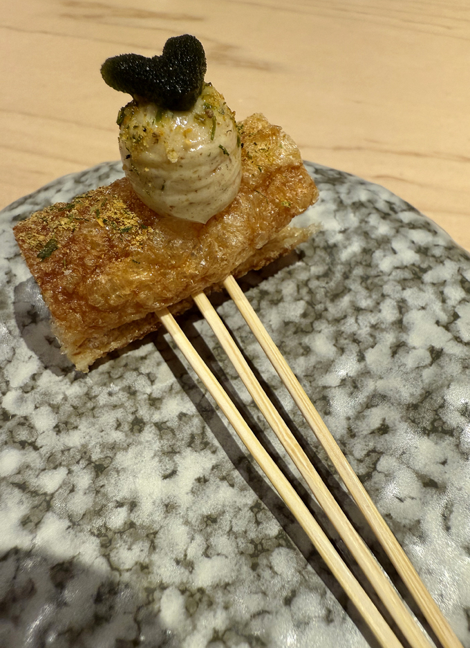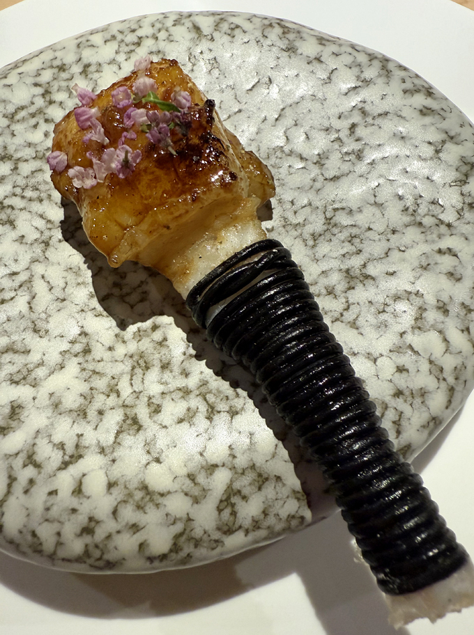 Second, there’s turbot engawa, a particular muscle on the fish that’s considered a delicacy like the cheek. Soft, with a slightly chewy, gelatinous texture, it’s seared, smoked, and brushed with teriyaki glaze and finished with shiso buds.