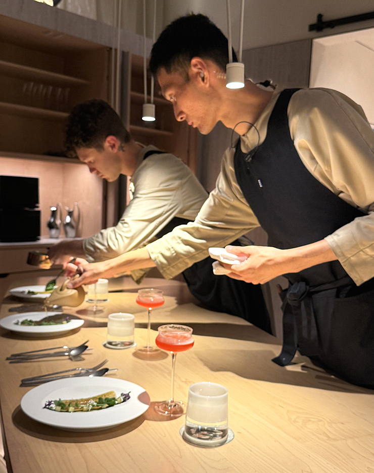 After that, you’re led inside to the elegant, minimalist dining room to your seats at the counter. A few of the seats at the end provide a small peek into the kitchen. But all have an up-close and personal view of the back counter, where dishes get their finishing touches.