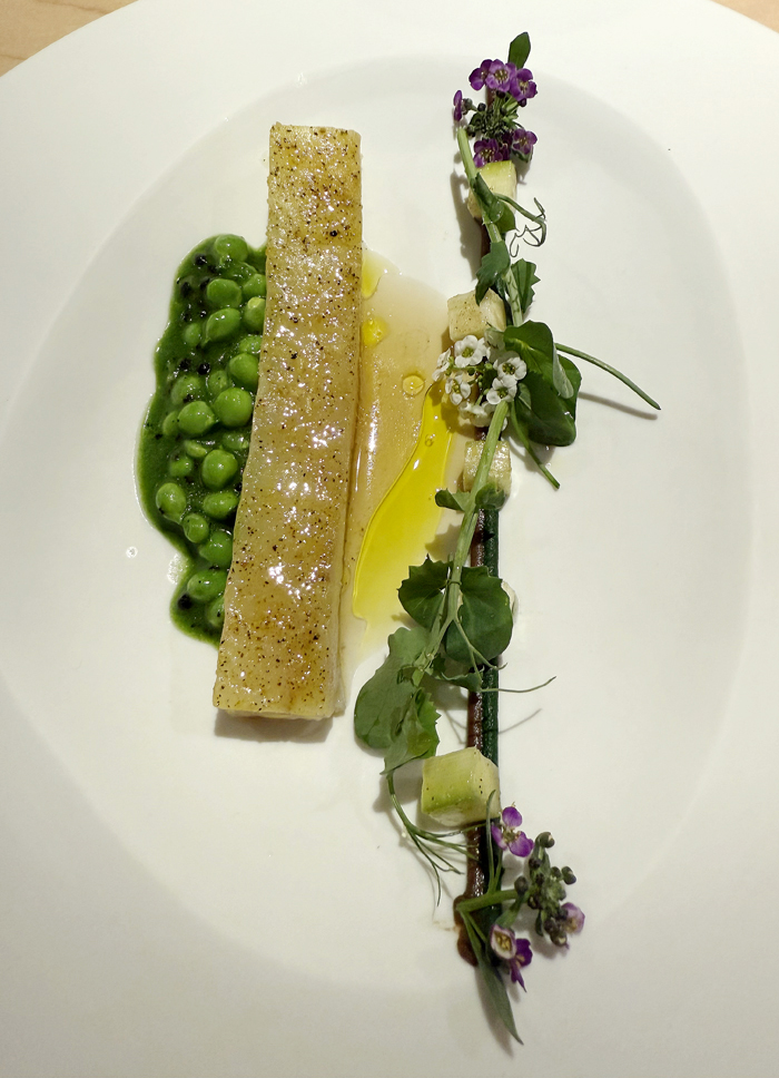 Spanish turbot arrives in a series of dishes. First, a slender, crispy-skin fillet finished with fish consomme, and served with a blood sausage puree, pistou, and peas interspersed with tiny balls of spherified squid ink to heighten the taste of the sea.