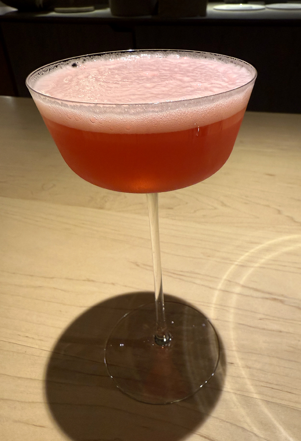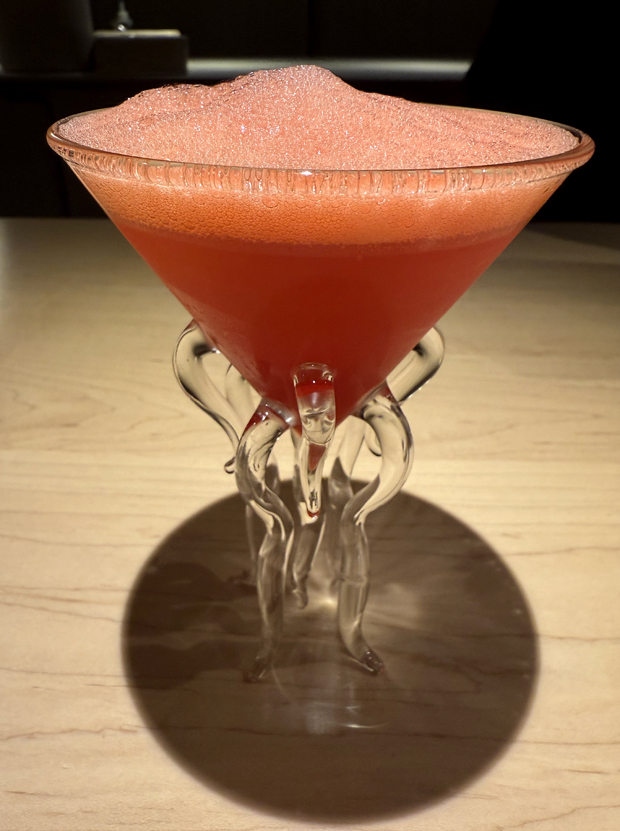 Because I chose the hybrid pairing, I was served “Blood of Tomato” in a dramatic martini glass that had shapely legs at the bottom. Made with tomato water with a kick of spice, it made for a light and lively non-alcoholic Bloody Mary.
