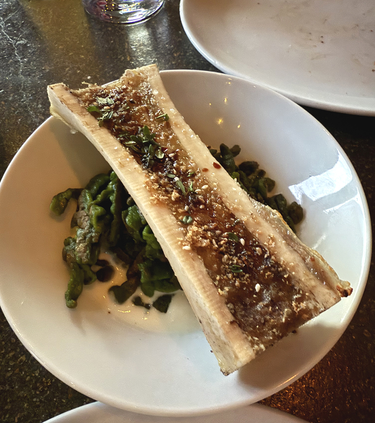 It’s recommended that you spoon half of the tuna into the center of the cracker to eat, then enjoy the remaining tartare with a spoon. The tuna is lush, meaty, and rich — even more so, thanks to the bone marrow.