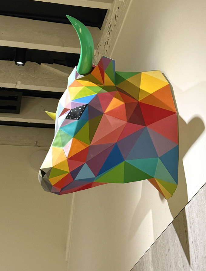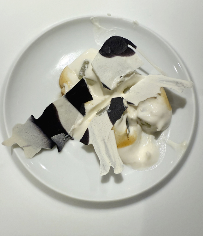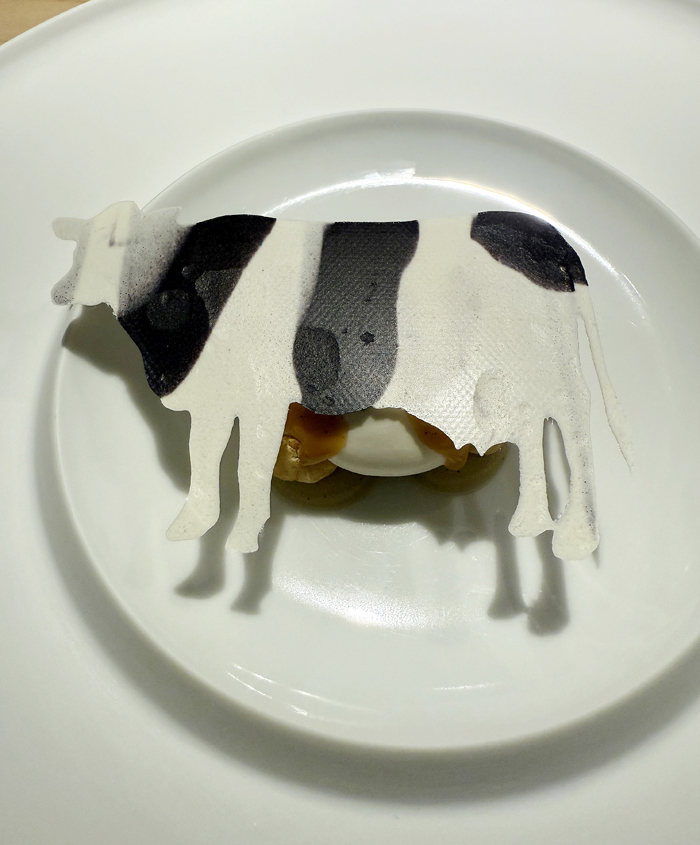 The “Cow and Her Milk” cheese course will prompt an ear-to-ear grin. How can it not when a cutout of a black and white cow is presented atop creamy, whipped Brillat-Savarin, apples and hazelnuts?