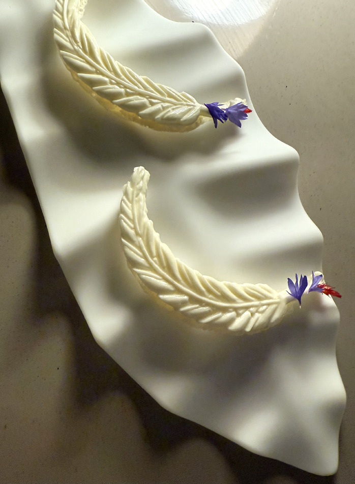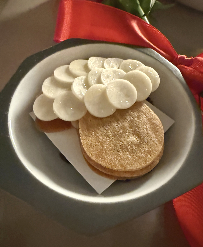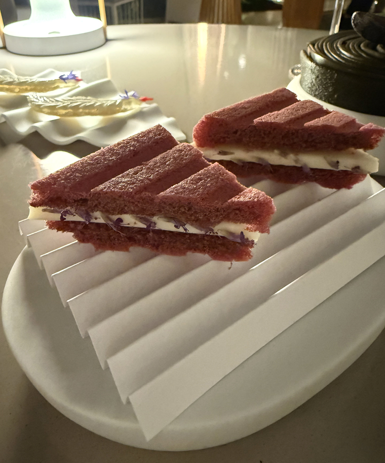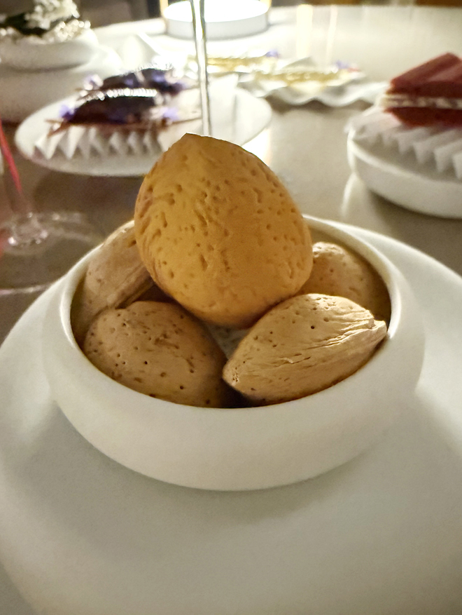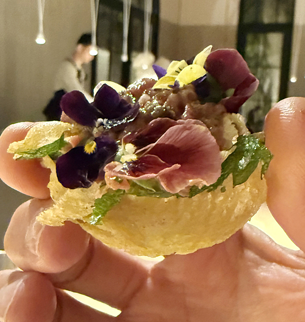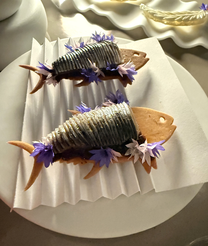 There’s what looks like a fuchsia-colored finger sandwich that turns out to be “bread” made of beet meringue, light and crispy, with a creamy filling. What appears to be an almond in its shell is actually a crunchy fried almond praline shell with almond cream. What seems like white feather quills are creamy Parmesan. A mussel shell holds not a real mussel but a delicate, filled squid ink cracker shaped exactly like one. A storybook-looking mushroom is in reality a truffle cheese mille feuille sandwich that tastes deeply of porcini, too. The winner for most audacious was the “sardine on toast.” Composed of a thin, crisp flatbread in the shape of a sardine, it’s topped with a real cured Japanese sardine that’s been sliced hasselback-style so that it almost looks like a tightly coiled Slinky. And yes, a chef actually had to make each of those exacting cuts by hand.