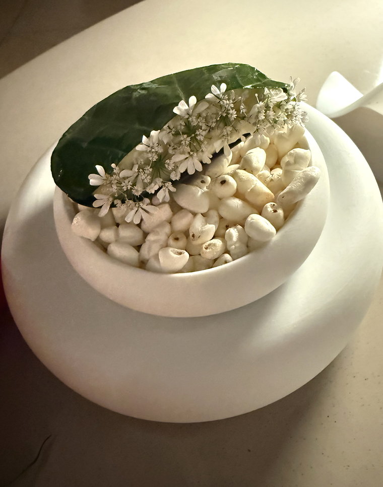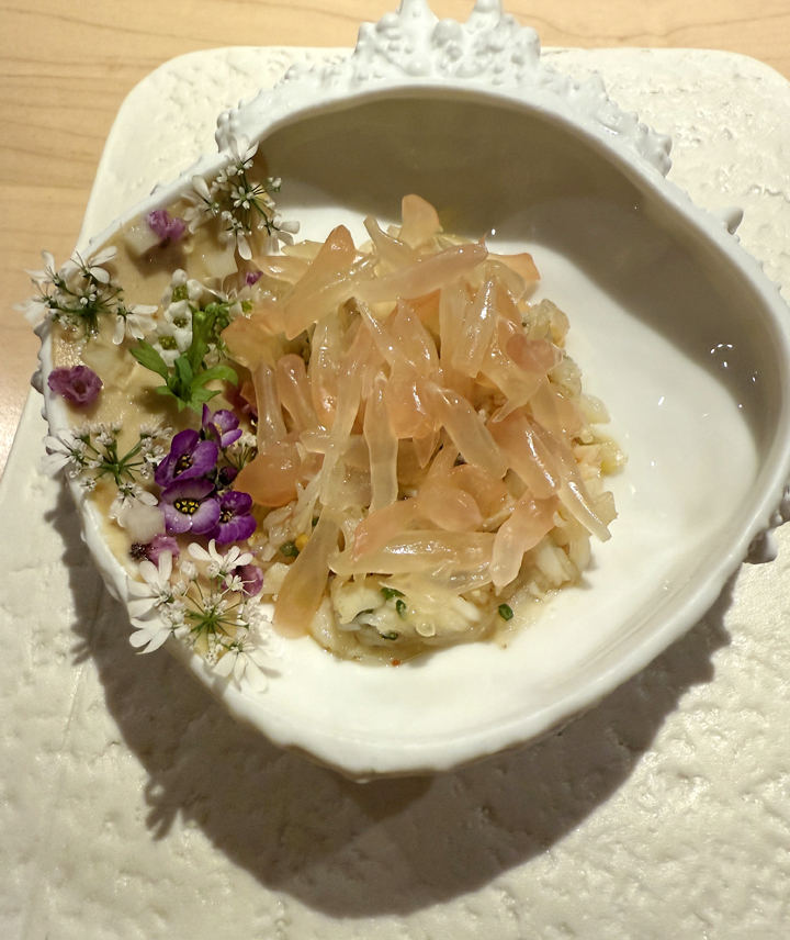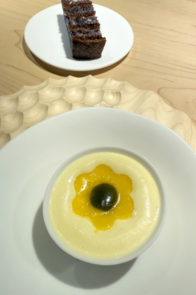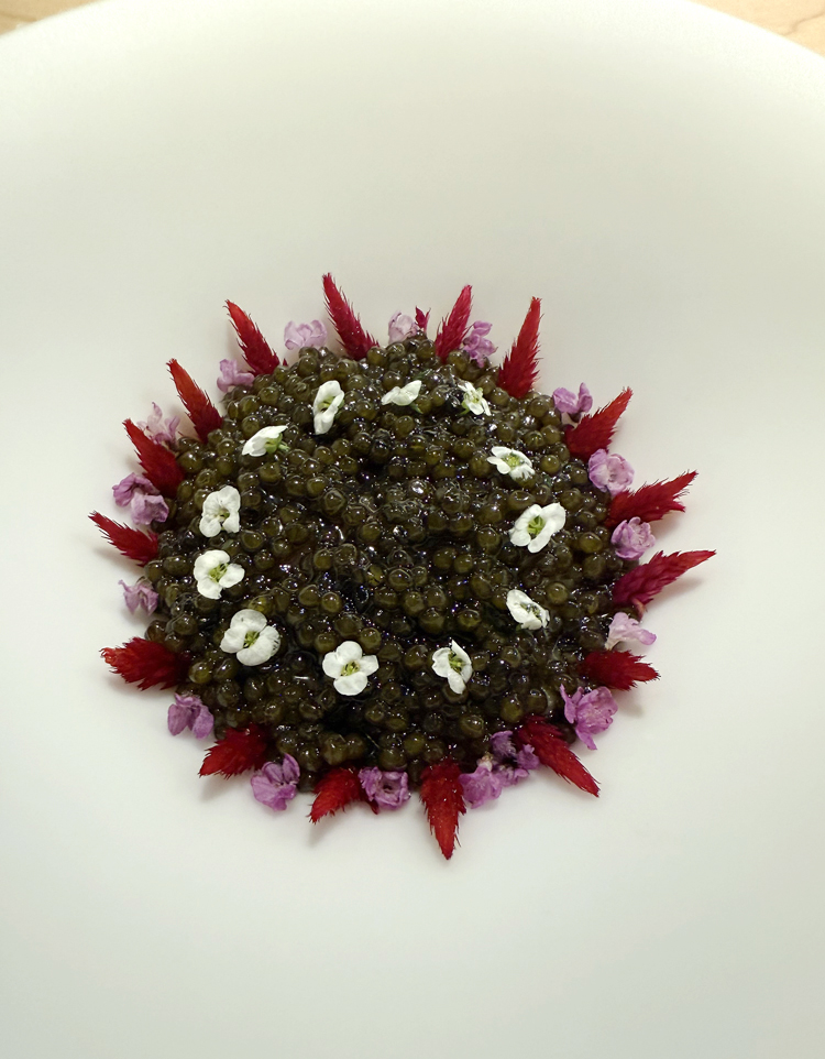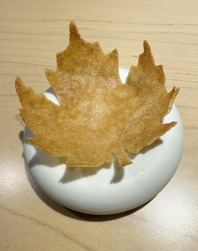 It’s a light, refreshing dish that paves the way for the indulgent one that follows: medium fatty tuna tartare with bone marrow that’s blanketed completely with kaluga caviar and tiny flowers to create a beautiful mosaic. A cauliflower cracker accompanies it, baked into the shape of a maple leaf in a nod to the maple trees in the courtyard, as well as to the counter and plates made of maple wood.