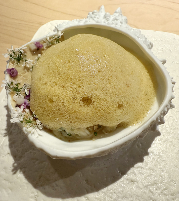 Sweet crab with finger lime and peeled pomelo gets finished at the counter with a spoonful of frothy coconut foam flavored with the crab shells.