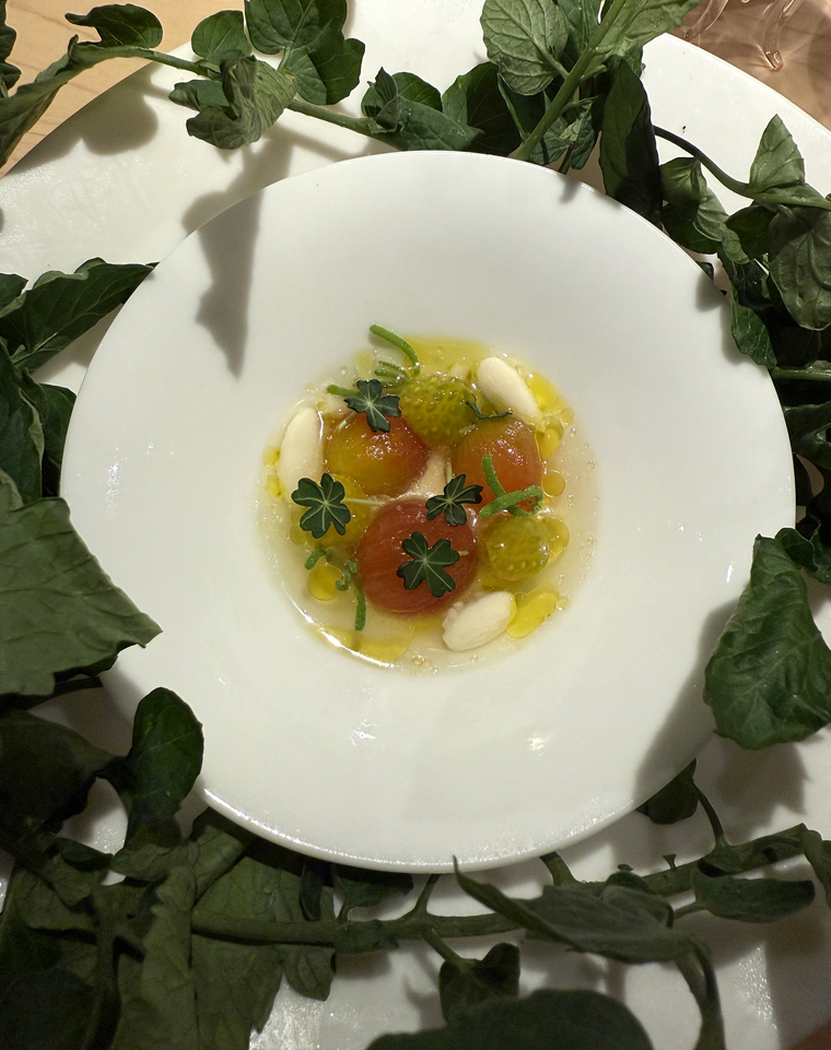 Ice-cold, bracing gazpacho arrives next, with its bowl surrounded by tomato vines to enhance its fragrance. There are peeled Firebird tomatoes that burst with juice, pieces of cucumber that refresh, ice plants that crunch, lovely olive oil with a buttery roundness, and eel cream that adds smokiness. Each taste makes you feel as if you’re sitting outside at a cafe in Barcelona in the heat of summer.