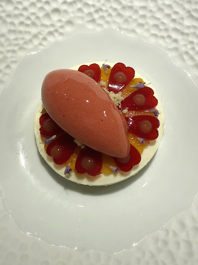 Dessert is a play on a Melba with a mousse-like amaretti semi-freddo with peaches, raspberries, and basil ice cream.