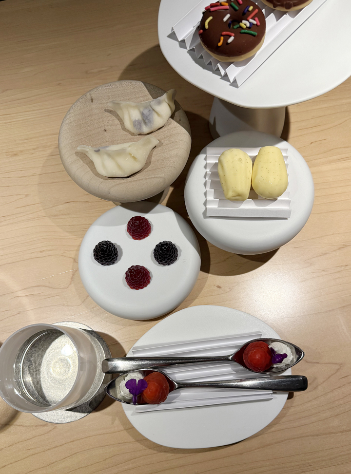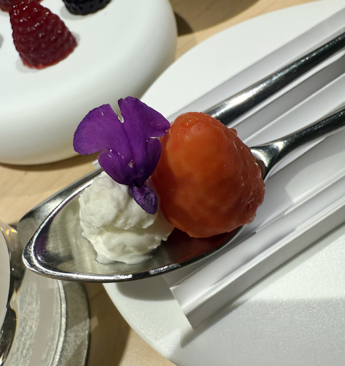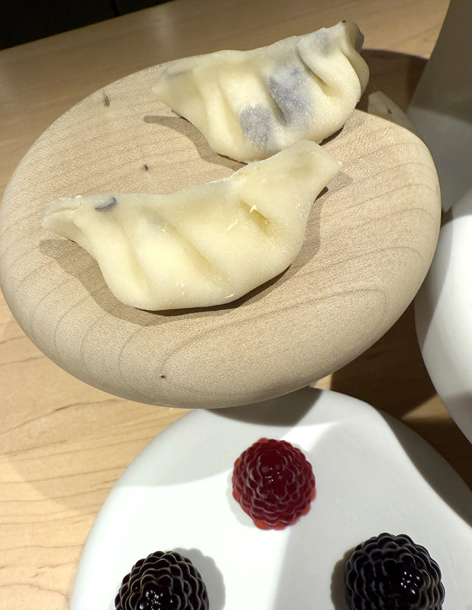 They include: quenching summer melon compressed with ginger; spoonfuls of frozen strawberries and cream that you have to eat in one bite as they gush with liquid inside; gummies that look exactly like blackberries and raspberries; “gyoza” that are really mochi dumplings filled with rice pudding; and adorable sprinkle donuts that shatter and disintegrate with the first bite to reveal caramel cream inside.