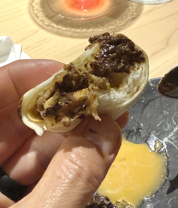A circular pool of curry sauce arrives on a plate, accompanied by a ridged steamed bun with a delectable filling of tender oxtail with black garlic. Dip the bun in the sauce and enjoy your new dim sum-like favorite.