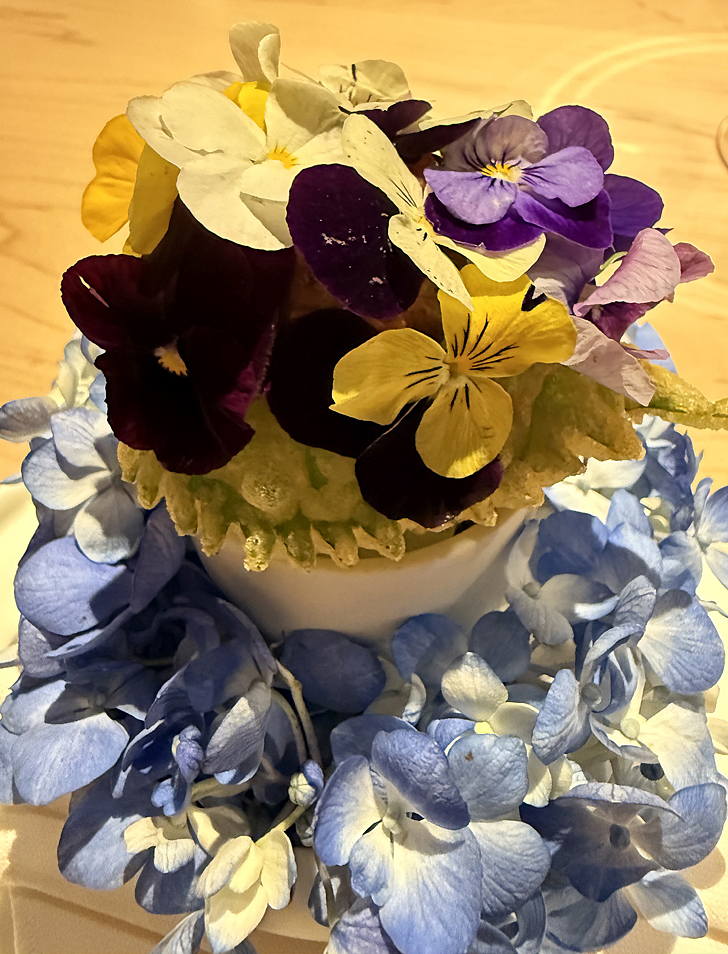 What arrives next would be right at home at a wedding place setting. White flowers edged with blue encircle a pedestal that is covered in yet more flowers, this time edible yellow, violet and deep purple nasturtiums. Hidden below is shiso tempura, the leaf brushed with the batter, then fried, so that a lacy, delicate shell forms a pocket around it that gets topped with the silky beef tartare finished with fried capers and shallots.