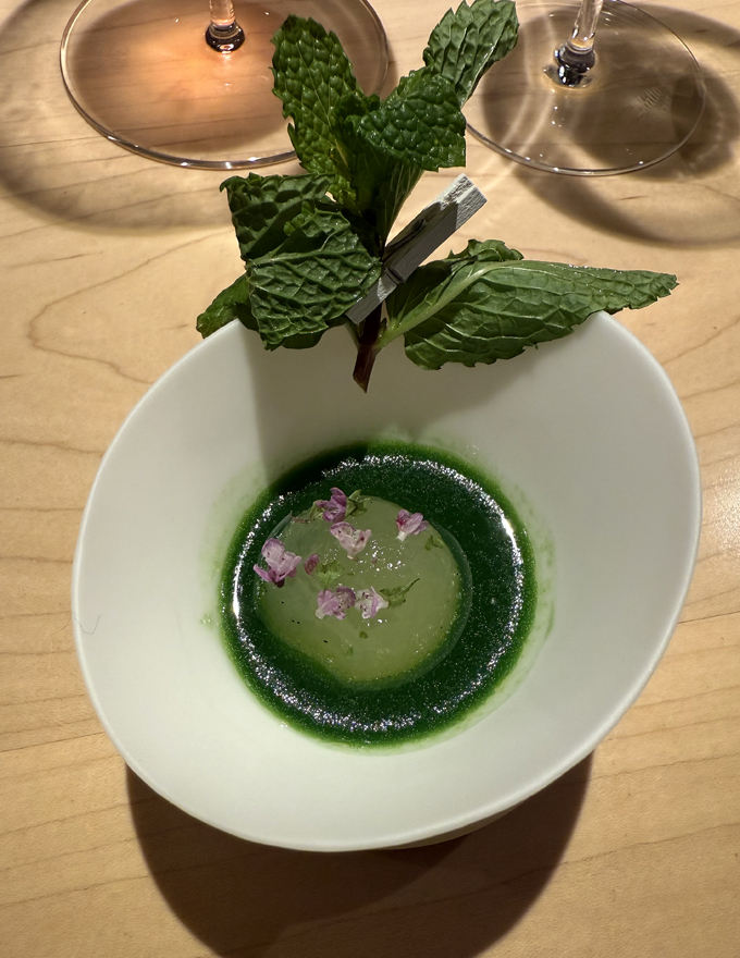 You’re seated at small tables with your party, and welcomed with flutes of Champagne and a glass of jade-green liquid, made from pea shells, lime and mint to resemble a non-alcholic mojito but with the concentrated taste of spring peas on the vine.