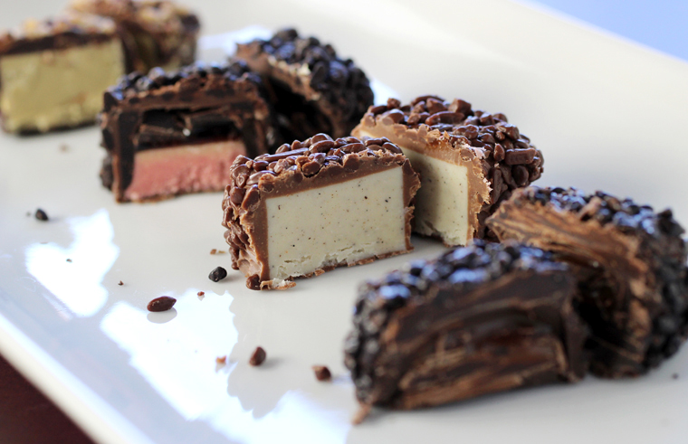 The two new flavors are: Lampone and Gianduia. The Lampone is layered with jammy raspberry coulis and a raspberry cream filling for a complex sweet that has a real zing from the fruit.
