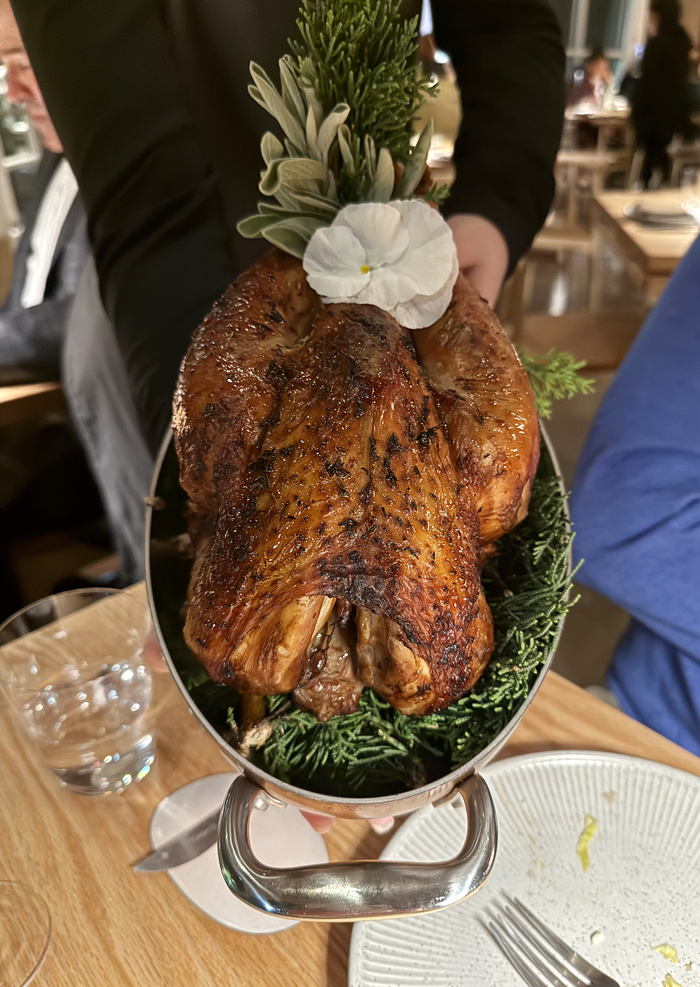 After roasting, each glistening, bronzed chicken is presented whole at the table with full pomp and pageantry before being whisked back to the kitchen to be sliced.