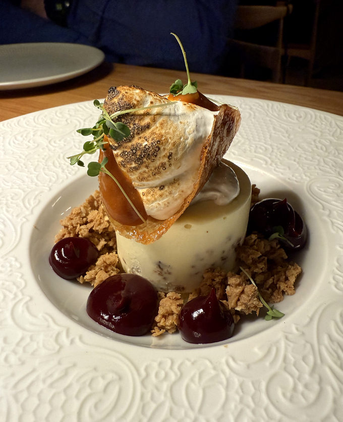 The baked Alaska ($15) gets crowned with a tuille cradling a fluff of torched meringue. It’s made with fried chicken ice cream, though, I can’t say that any of us detected any poultry flavor. Nevertheless, it was a wonderfully satisfying dessert with its silky ice cream, buttery Speculoos crumbles, raspberry compote, and spicy caramel.
