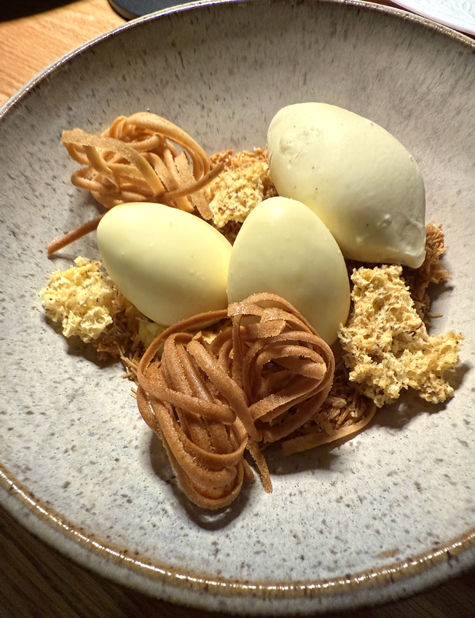 The most attention-getting dessert has been the Camembert cheesecake ($15) for its playful plating. It looks like a bird’s nest with eggs. Resting on a tangle of fried pastry strands, the white chocolate egg shells give way to the creamy cheesecake and sharp calamansi curd, along with a pineapple-pumpkin compote. Camembert can get pretty funky the more it ages. You can definitely taste the savoriness of the cheese here, but it never gets too pungent. The tartness of the curd really brightens and lightens it, too.