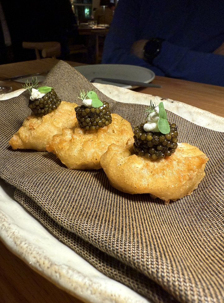 Heritage chicken nuggets (2 for $38) are indeed like fried chicken nuggets gone posh with a big dollop of Keluga caviar plus creme fraiche. Lightly battered and quite crisp, the two-bite nugget is very moist. The caviar adds salinity, butteriness, and a je ne sais quoi. There’s also a slight fishiness, so you do have to like that kind of land-sea pairing.