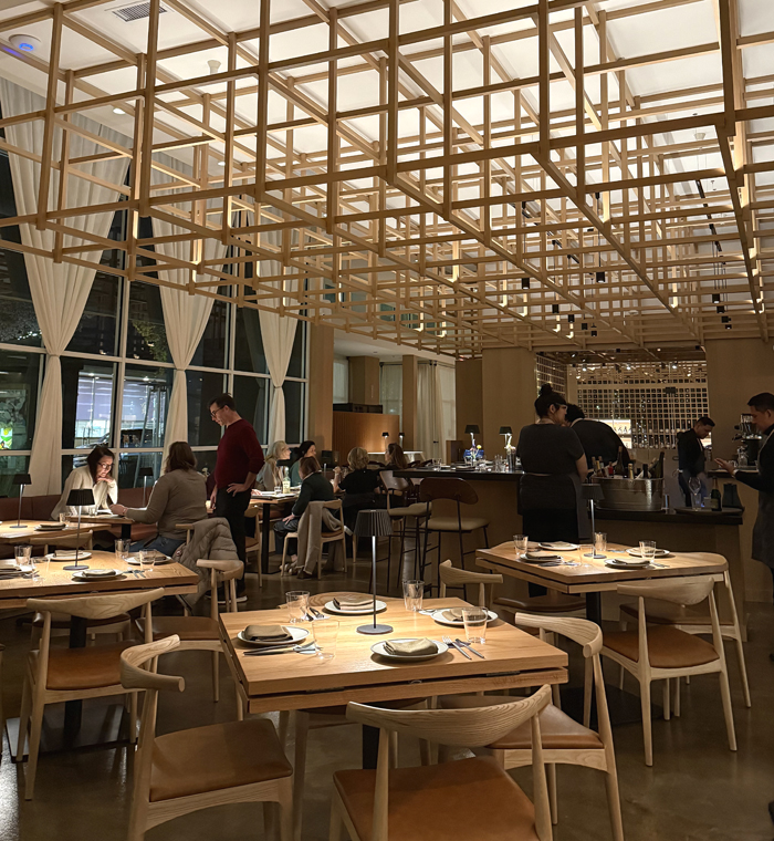 There’s outdoor seating, private dining room, and a spacious bar. The ceiling is a focal point with its wood framework that mimics a massive wine storage unit.