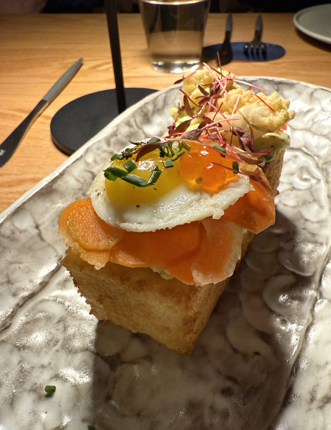 A thickly-filled 7-Eleven milk bread sandwich from Japan won’t necessarily come to mind with the heritage egg salad ($15 for one). This is its glammed-up, blinged-out cousin, with a thin layer of creamy egg salad smeared atop an outrageously buttery and crispy brick of brioche. Think the best French toast imaginable. The top is dotted artfully with a cute sunny-side up quail egg, salmon roe, fluffy scrambled egg, and pickled vegetables. It’s like a fancy passed hors d’oeuvre you’d find a butler carrying on a tray at a holiday party. Or so I imagine.
