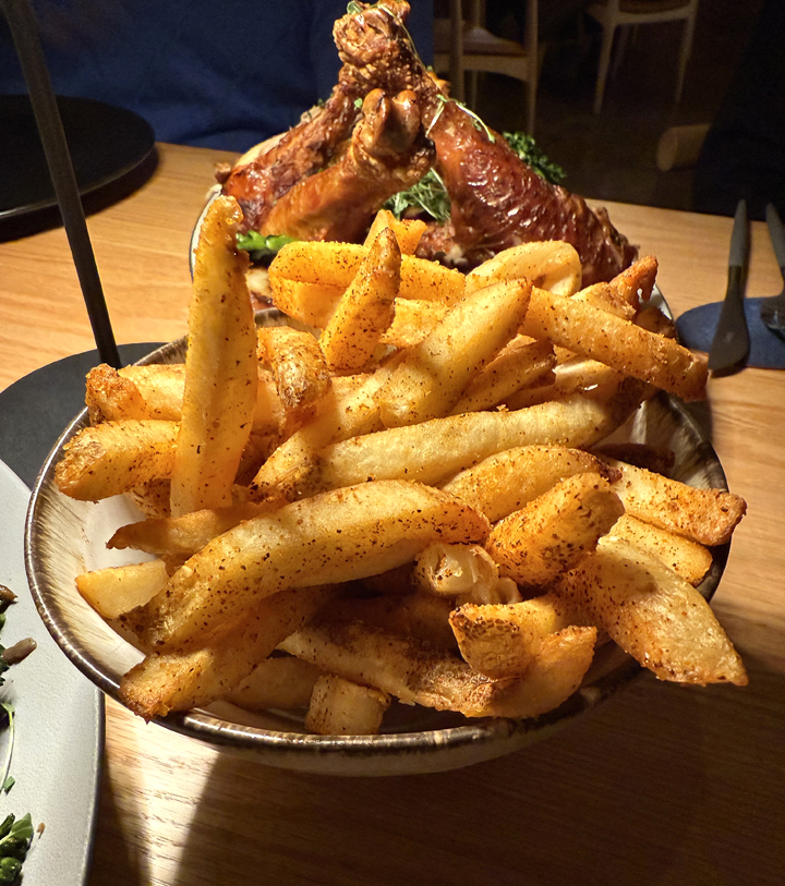That comes into play, too, if you order the fries ($13). They’re nicely crisp and tossed in a spicy, seasoned salt, which when eaten with the chicken might be too much salt for some. The accompanying creamy, refreshing yuzu aioli helps temper that, though.