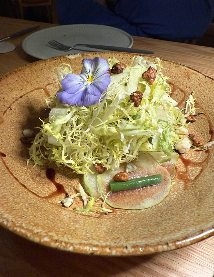 The shaved Bartlett pear salad ($18) is a nice respite from all that richness, done up prettily with curly endive and crispy walnuts in a light sherry-walnut vinaigrette with a blue nasturtium and crumbles of Point Reyes Blue.