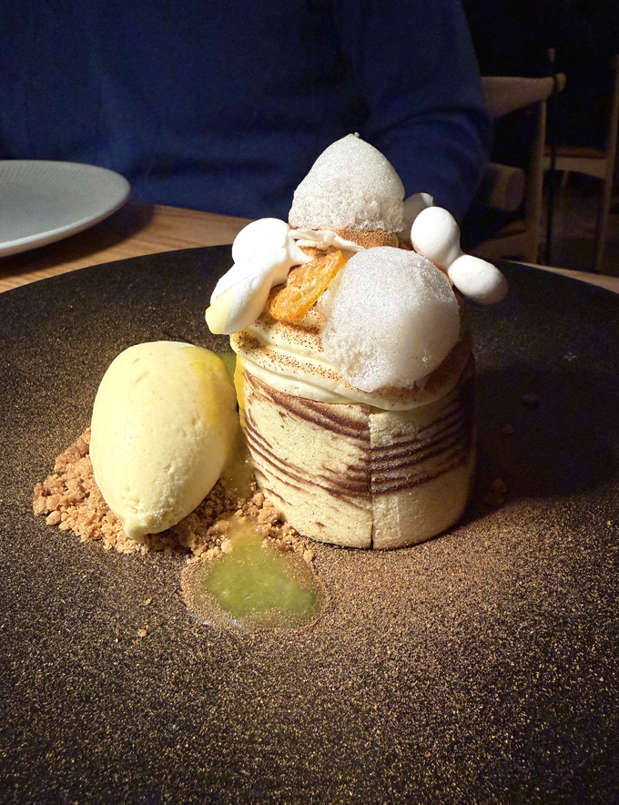 The yule log ($15) looks nothing like the traditional one typically served on its side with meringue mushrooms. This one is a stump of light-as-air Japanese sponge cake with buckwheat and ginger that gets finished at the table with fermented kumquat sauce. The accompanying bourbon-soba ice cream tastes a little like root beer on the finish.