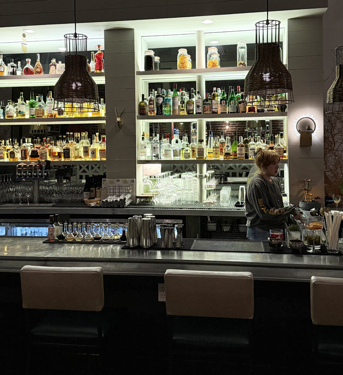 The Swallow ($19) is a bourbon- and brandy-based cocktail that comes to the table in dramatic fashion — ignited at the table (video) to finish the drink with a waft of pecan wood smoke. It’s deliciously smoky and toasting tasting, with an edge of bitter orange from the French liqueur known as Bigallet China-China Amer.