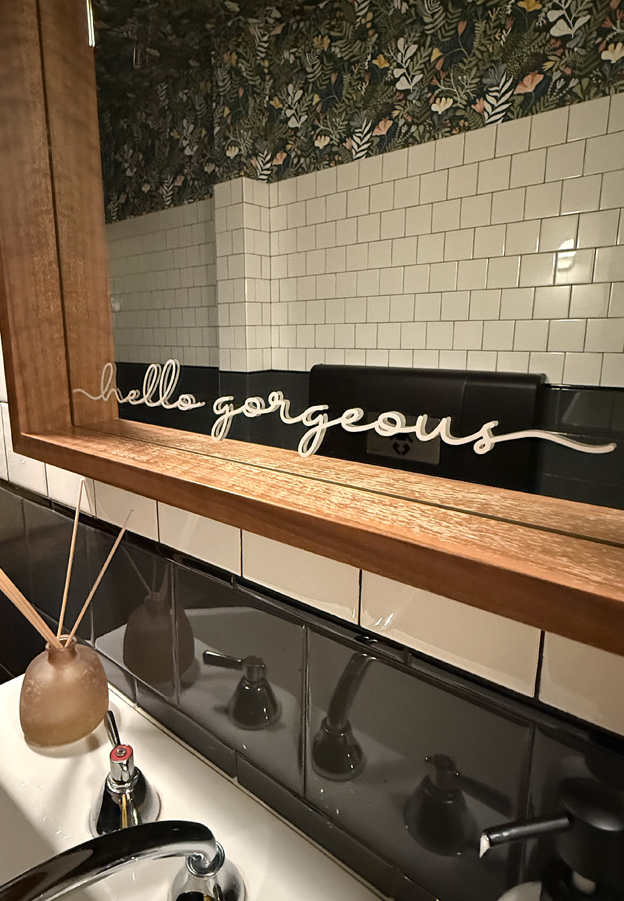 It’s all in the little touches: The bud vases and candles on each table. The faux fireplace that creates a cozy feel. The homey bookcase with shelves filled with plants, books, and framed photos. And the floral wallpaper, free feminine products, hand lotion, and sweetly etched mirrors in the bathrooms.