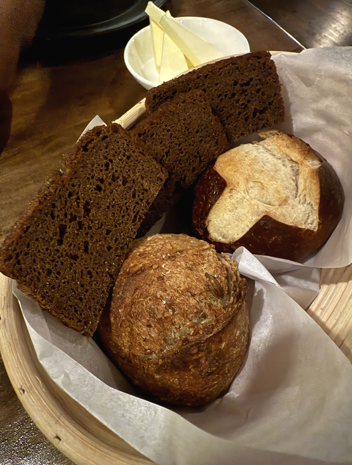 In keeping with the restaurant’s mission to support women, the very fine selections in the bread basket ($10) come from San Francisco’s Cuprum Bakery, owned by Lera Romashchenko. They include a delightfully chewy pretzel roll, a nutty walnut roll, and slices of dark rye with an irresistible whisper of sweetness.