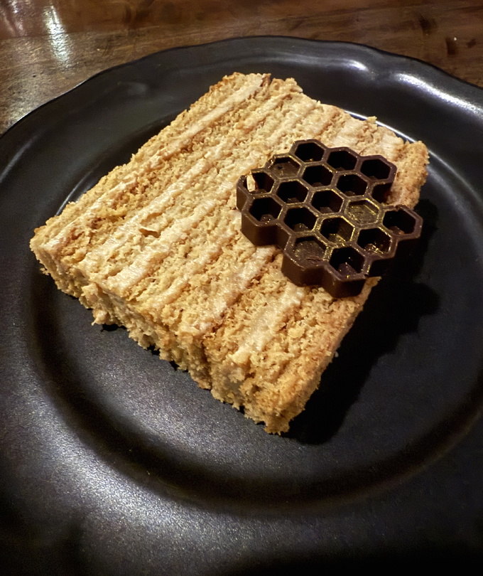 Plus, with no mashed potatoes, that meant I had even more room for dessert. And the honey cake ($14) is definitely worth saving room for. The slab of cake with its multi layers of thin sponge and creamy filling of honey, sour cream, and caramel is moist and tender. You definitely taste the floral honey, along with an almost malty note. A chocolate honeycomb makes for an adorable garnish.