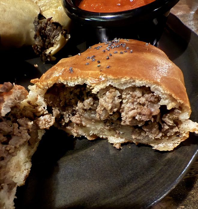 They both sport tender pastry shells. The mushroom one is loaded with the funghi, offering up a deep earthy flavor. The other brims with ground beef with onions. Accompanying them are crocks of sour cream and a tomato sauce that gets a hit of warmth from ginger. The piroshki are like a meal unto themselves. In fact, I’d happily eat one for lunch a couple times a week.