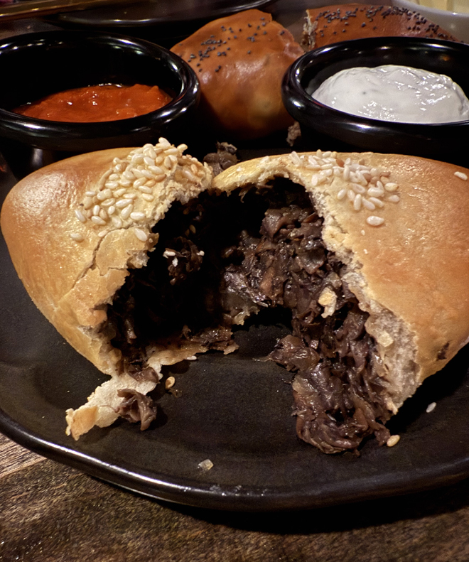 Piroshki are so seldom seen that when you do spot them, they’re a must order. Choose egg & spring onion ($9), mushroom ($9) or beef ($10). We went with the latter two with the beef one distinguished by its bronzed color and sprinkle of poppy seeds, and the mushroom one more golden with sesame seeds flecked over top.