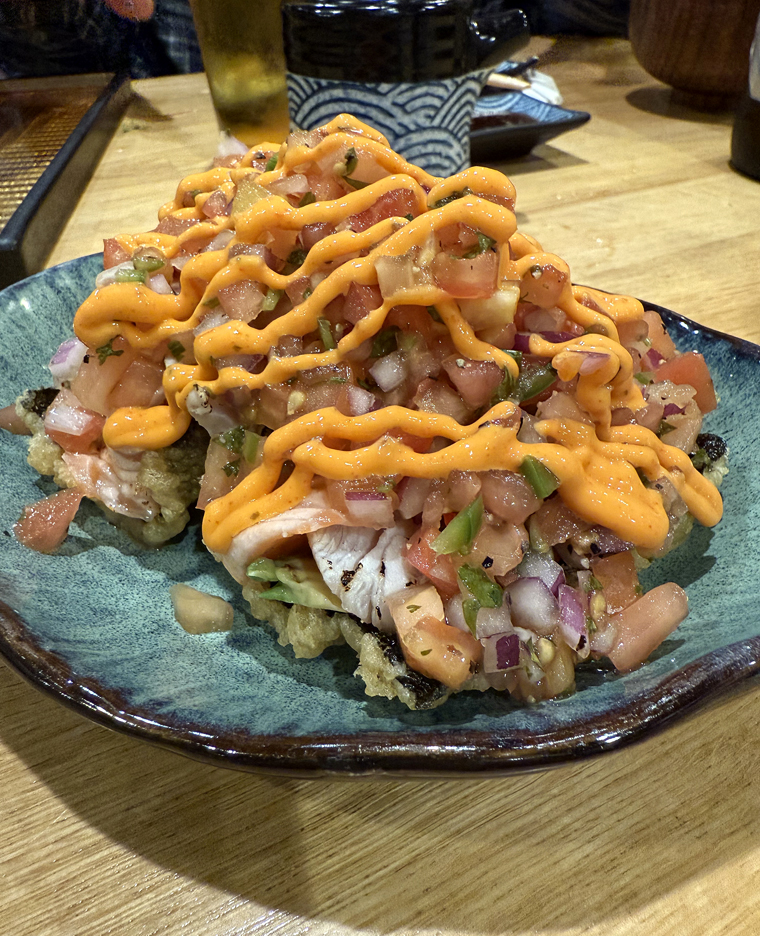 For a more novel creation, look no further than the fish tacos (a pair for $12.95). Tempura-fried nori takes the place of a crisp tortilla, and gets filled with seared albacore, salmon, avocado and pico de gallo. It’s smoky, a touch spicy, and vibrantly fresh tasting. It’s a little Mexican and a lot Japanese.