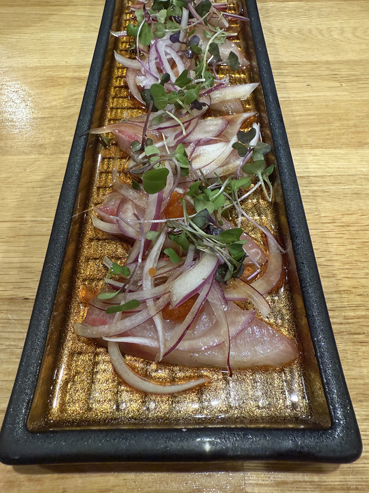 With its clean, bright flavors, hamachi carpaccio ($17.95) is a wonderful way to start. Slices of raw yellowtail are strewn with sweet, sharp and crunchy raw onion slivers, radish sprouts, and citrusy ponzu sauce.