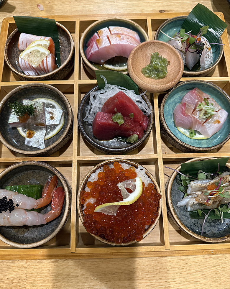 The omakase sashimi is one of the restaurant’s most expensive offerings at $63.95. The presentation is beautiful, with a 9-compartment bento box brought to your table, each holding a small ceramic dish of sliced fish. It’s billed as 16 pieces of fish with one mini ikura don (salmon egg rice bowl). There’s also a small serving of pickled wasabi stems.