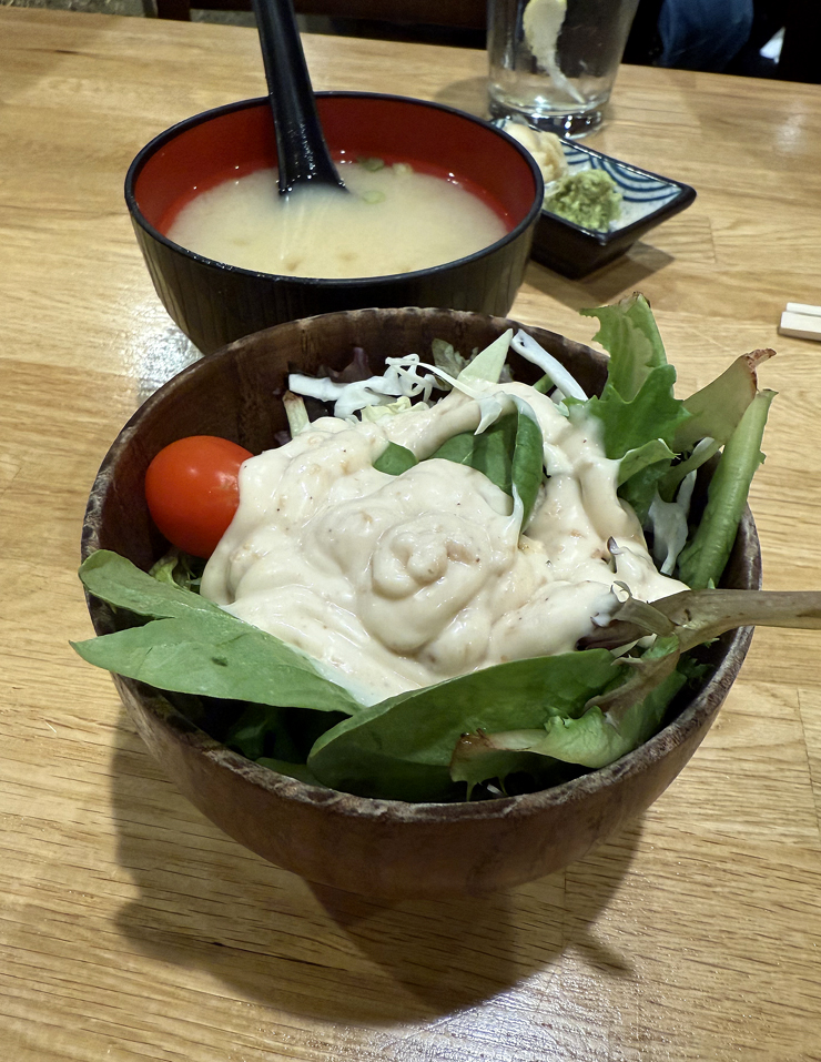 It comes with miso-seaweed soup, and a green salad that was overzealously dressed with a thick, creamy miso dressing.