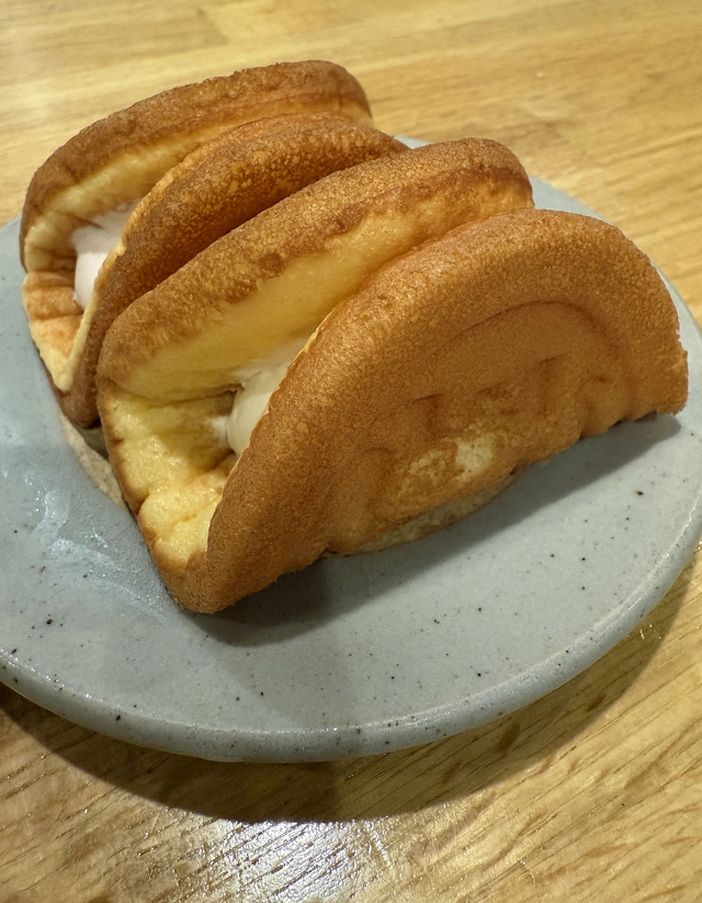 The waffles are folded taco-style around the filling. They are soft and cakey, along the lines of dorayaki pancakes. Or as my husband declared, “Like Twinkies.”