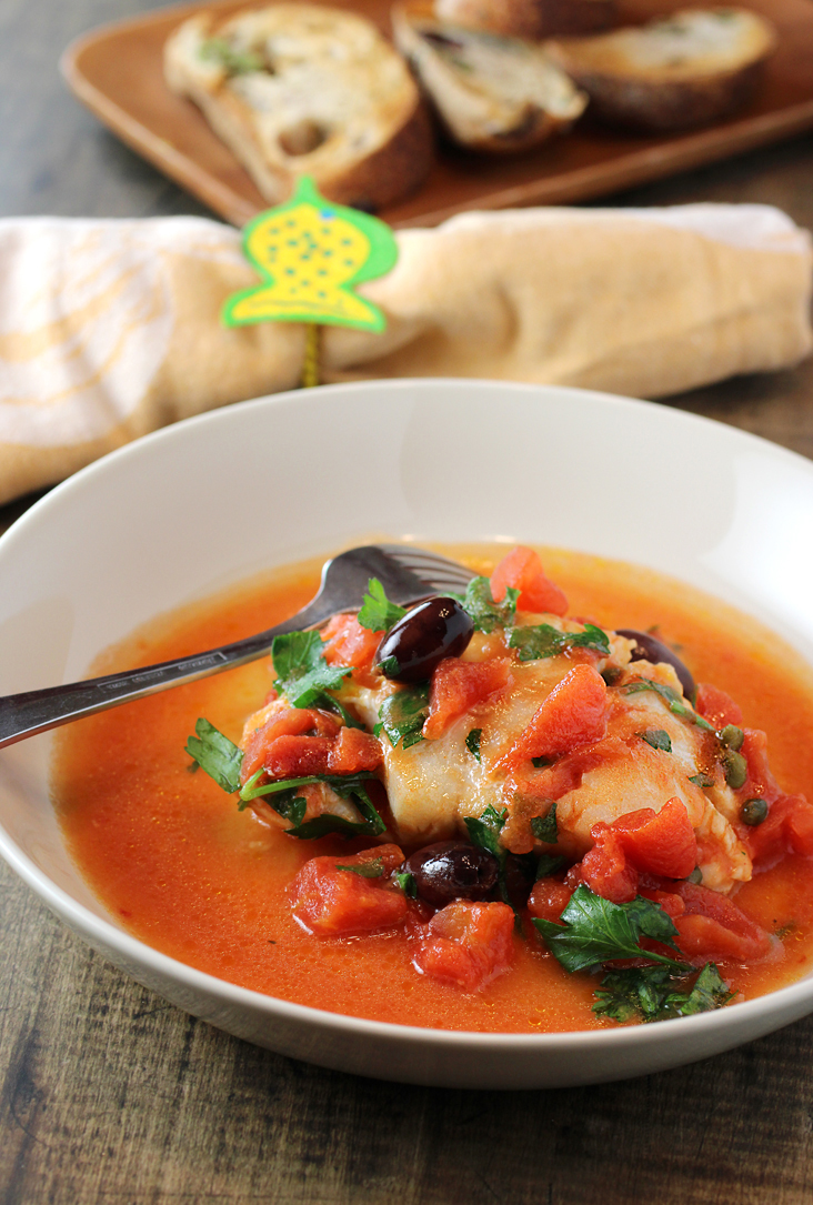The fish cooks up flaky and very moist. You’ll want to serve it with toasted or grilled bread to dunk into the delicious tomato sauce.