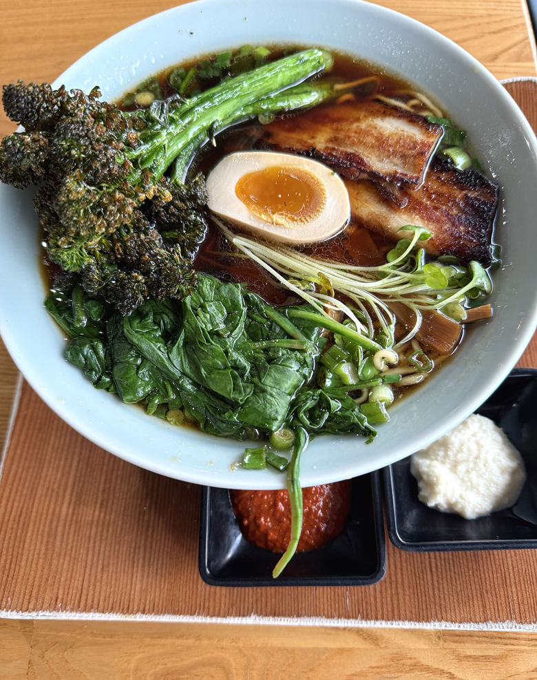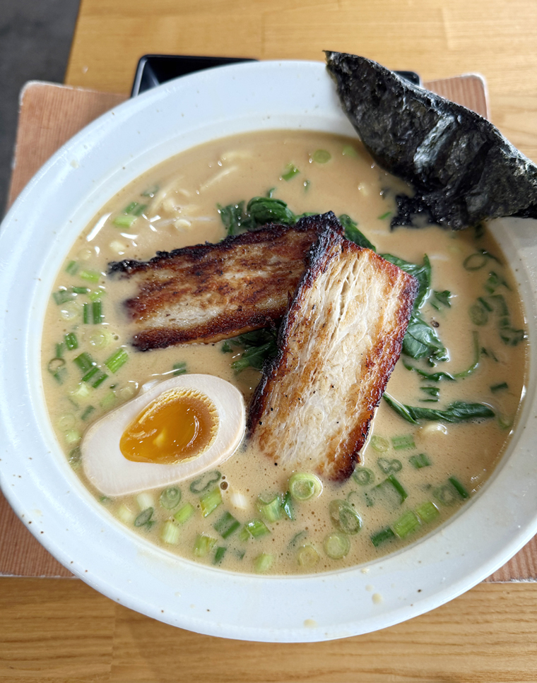 The noodles were bouncy and supple. Two juicy, fatty slices of chasu garnished the bowl, along with spinach, green onions, bean sprouts, seaweed, and half a soy-sauce egg.