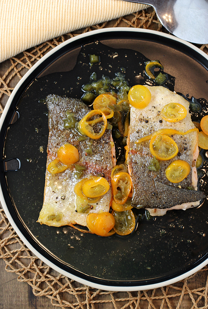 When the fish is done, serve it with a slightly syrupy sauce made from simmering sliced kumquats with chopped jalapeno, sugar, lemon juice, lemon zest, and white wine vinegar. The sauce takes all of about 15 minutes to make. You may need to add a pinch more sugar, depending on how sweet your kumquats are.