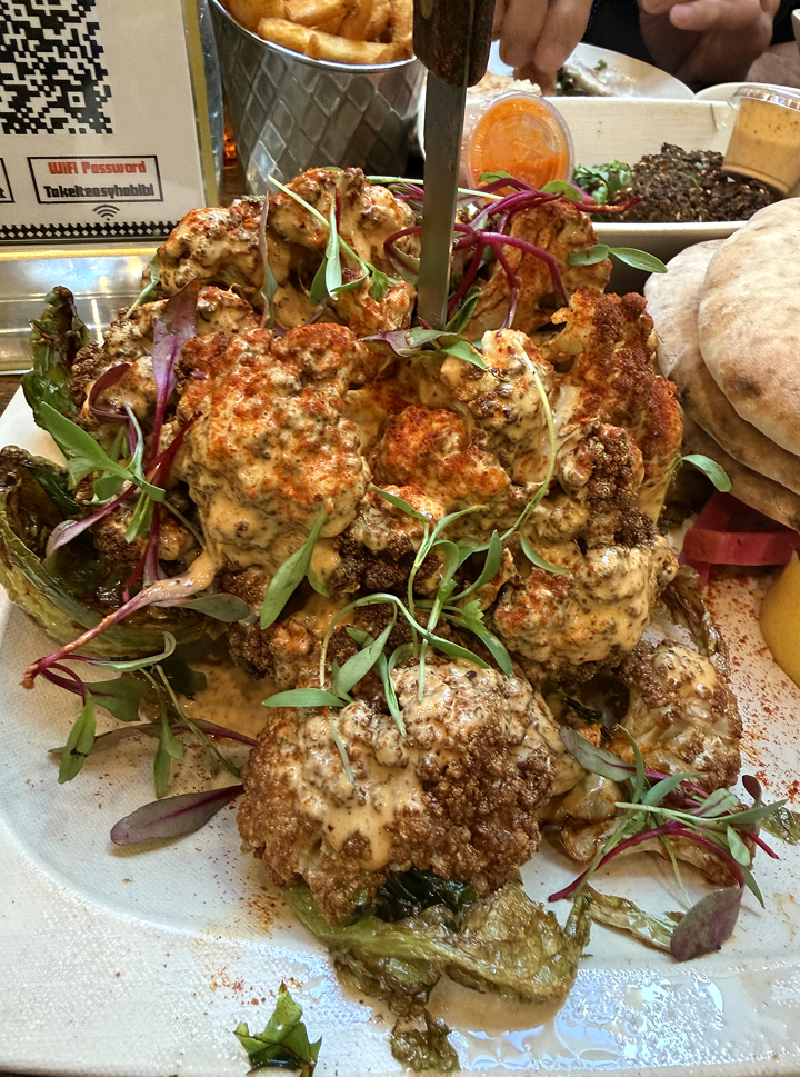 The whole heirloom cauliflower ($14) arrives with a steak knife stabbed into it to make cutting easier. It’s wonderfully charred and smoky tasting, with creamy tahini brushed over the top. It’s not to crunchy or too mushry, but the perfect tender texture.