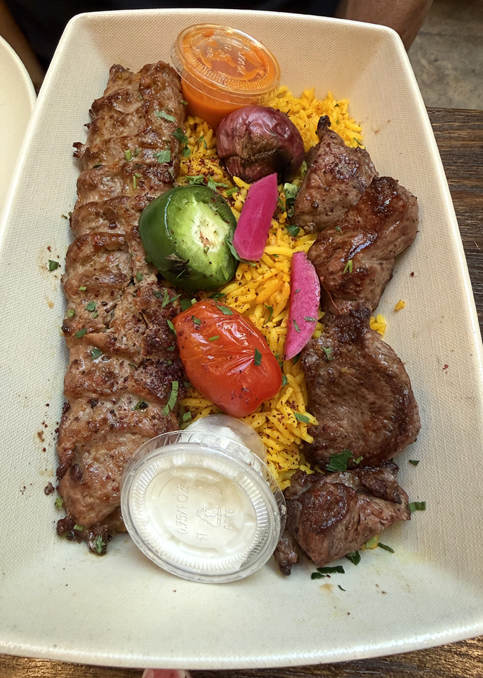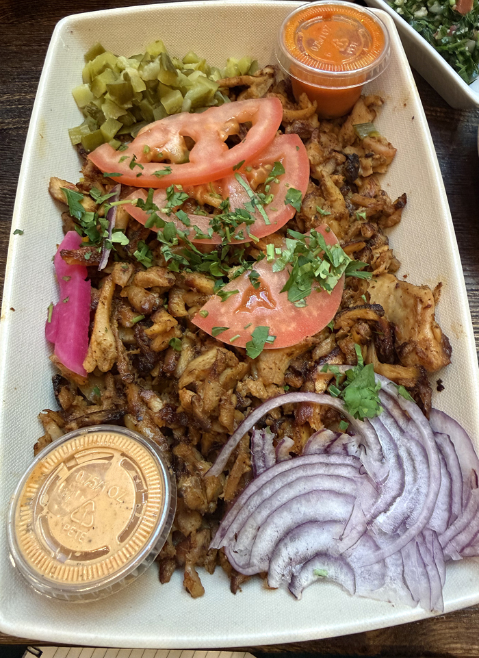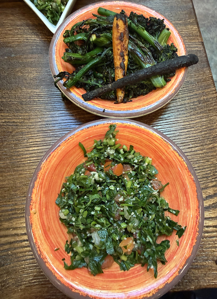 For the mains, I went with the chicken shawarma plate. Crisp, thin slivers of smoky, flavorful chicken are piled atop basmati rice with pickles, slices of red onion and some forgettable slices of tomato. It comes with pita bread, plus your choice of two sides. I went with more of the vibrant tabbouleh, and the roasted veggies, which consisted of very smoky tasting al dente broccolini and carrots. It comes with containers of hot sauce, which definitely has a kick, and garlicky toum. All of this for $22, a real deal in this day and age.