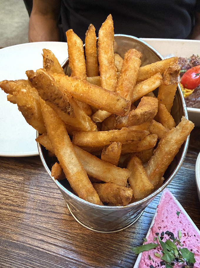 My husband opted for the double kebab plate ($26), choosing the lamb and beef kofta kebabs. Both were delicious, especially the succulent lamb. The plate came with the same rice, pickles, pita, and sauces. For sides, he chose the nicely crisp french fries and the hummus.