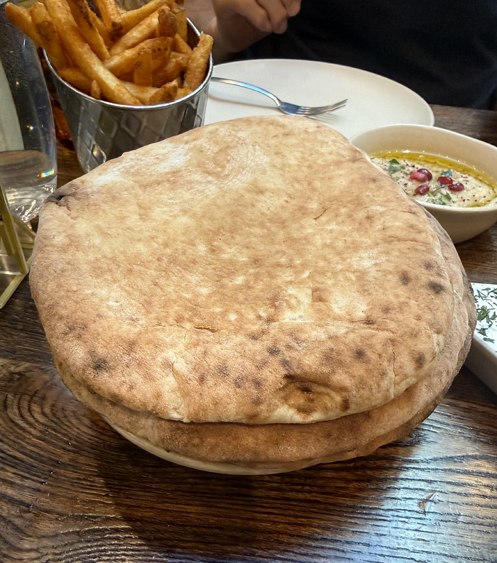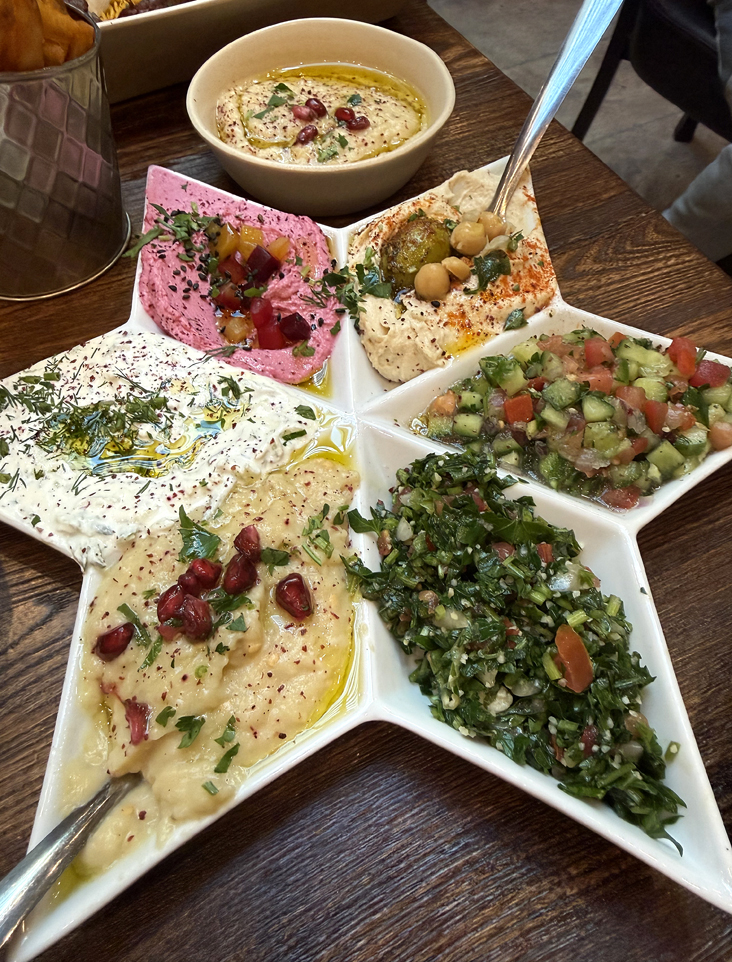 Settle in with the falafel mezza sampler ($24), which is served in a large star-shaped plate with divots holding creamy hummus, smoky tasting baba ghannoush, creamy dill-scented tzatziki, fresh tasting tabbouleh, bright pink roasted beet dip, and Arabic salad of chopped tomatoes and cucumbers, as well as pickled vegetables. A stack of warm pita is at the ready to slather, smear, and dip to your heart’s and stomach’s content.