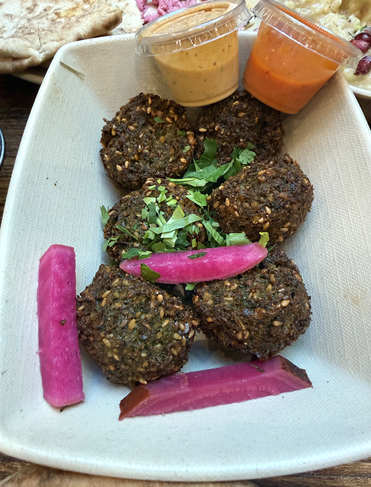 The sampler also comes with a half dozen of some of the best falafel I’ve had in a while. They’re hot, crunchy on the outside, vividly green inside, and so herbaceous and nutty tasting throughout.