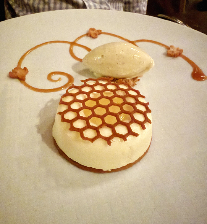 My husband’s Meyer lemon chibouste, an airy citrus-scented pastry cream, was as light as can be, atop a nutty tasting spelt shortbread. It was accompanied by chamomile honey ice cream with graceful floral notes.