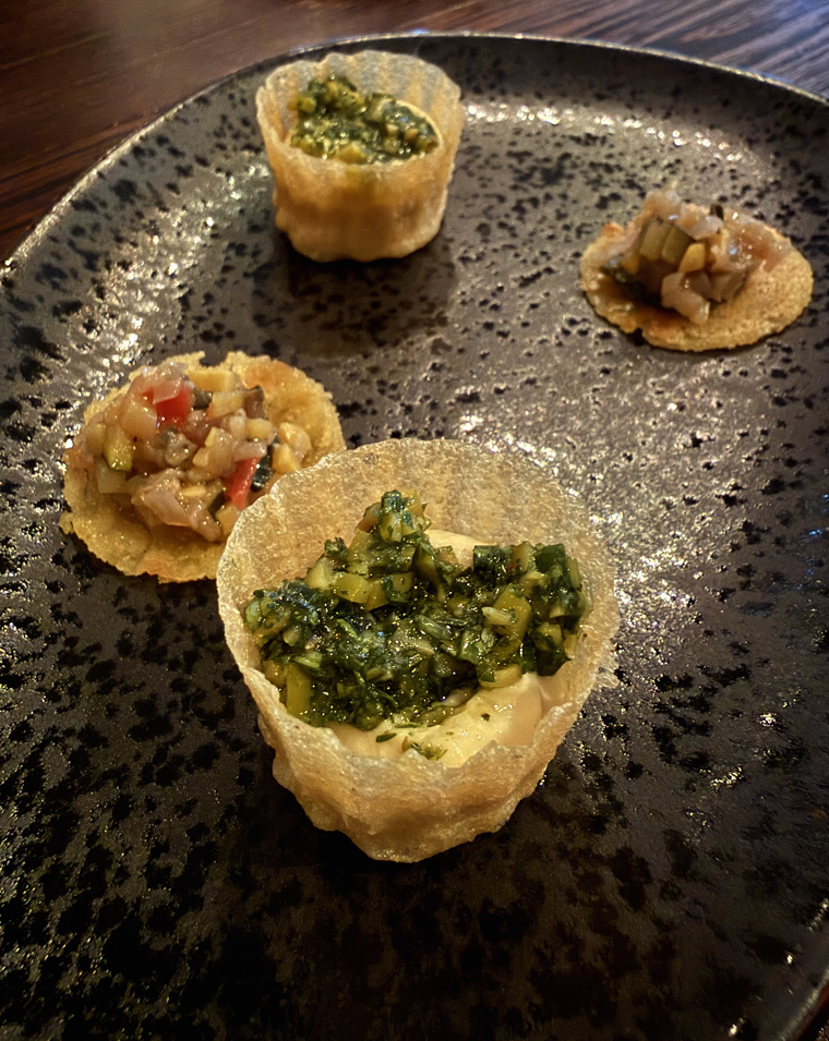 The two tasting menus commence with the same first canapes: crisp, buttery tart shells that are paper-thin, with one filled with ratatouille, and the other with hummus and chimichurri.